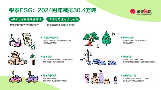 報(bào)告顯示,過去一年在可持續(xù)發(fā)展ESG領(lǐng)域,銀泰百貨在全國(guó)范圍內(nèi)獲評(píng)“綠色商場(chǎng)”門店達(dá)40家,綠色電力使用比例達(dá)47.3%,能源轉(zhuǎn)型帶來減排30.4萬噸。
