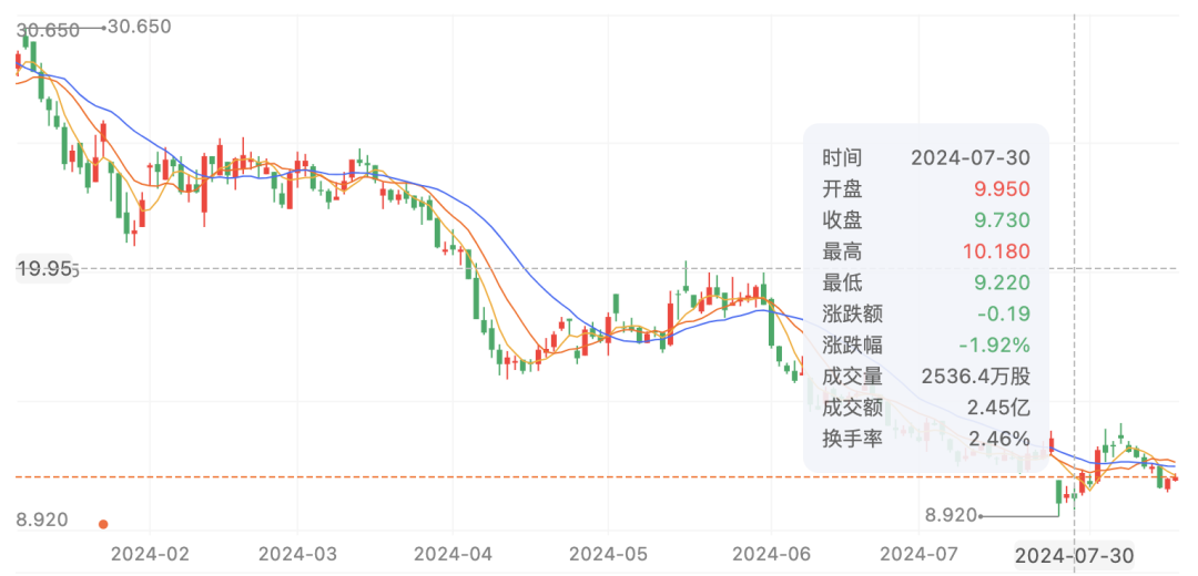 如果我們將時間線拉回到2024年的1月2日,當時東方甄選的開盤價為28港元,而到了7月30日收盤時,其股價已經(jīng)跌至9.730港元,這意味著年內(nèi)股價跌幅達到了65.3%,與2023年初的股價高點75.55港元相比,東方甄選的股價下跌了87.1%,市值減少了678.6億港元。