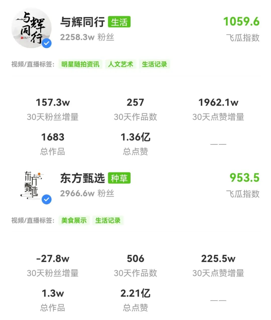 據(jù)飛瓜數(shù)據(jù),與輝同行近30天的粉絲增量為157.3萬,點贊增量1962.1萬。東方甄選這邊就慘了,近30天點贊增量連前者零頭都沒有不說,粉絲量還減少了27.8萬。相比而言,董宇輝確實更適合直播。