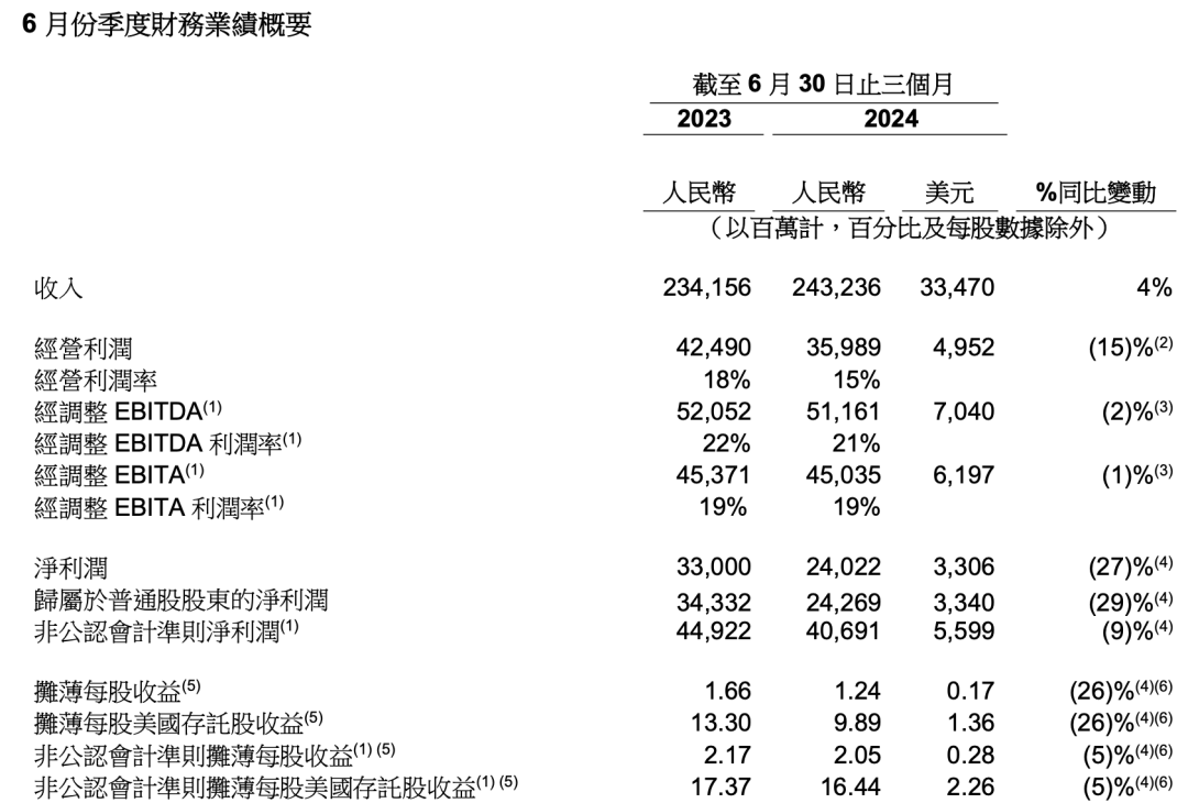 先來看阿里,根據(jù)財(cái)報(bào)顯示,2025財(cái)年第一財(cái)季((2024年第二季度),阿里實(shí)現(xiàn)收入2432.36 億元,同比增長4%;經(jīng)調(diào)整EBITA為450.35億元,同比下降1%;非通用會(huì)計(jì)準(zhǔn)則(Non-GAAP)凈利潤為406.9億元,同比下降9.4%。