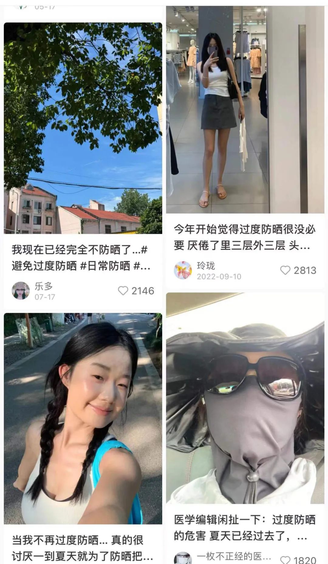 社交媒體平臺(tái)上出現(xiàn)了不少拒絕“過(guò)度防曬”的聲音。在小紅書(shū)上,“過(guò)度防曬”相關(guān)筆記已有超5萬(wàn)篇,不少女性表示“曬一會(huì)兒太陽(yáng)不會(huì)讓你變得更糟,很多時(shí)候不用活得那么辛苦!