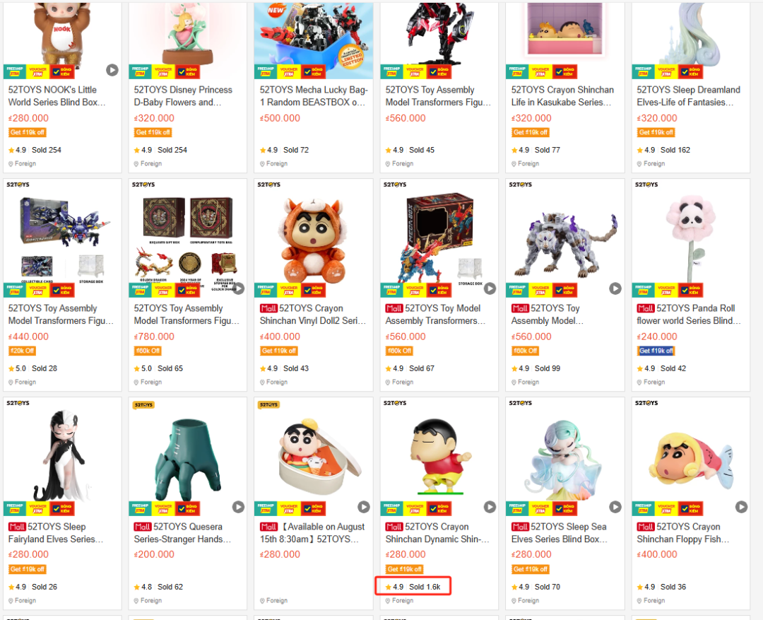 52TOYS目前在東南亞市場銷量較好的產(chǎn)品系列,仍是經(jīng)典IP系列衍生品。52TOYS Shoppe越南站官方旗艦店中,蠟筆小新、睡眠夢境精靈等經(jīng)典IP衍生品月銷普遍百單,如蠟筆小新動態(tài) Shin-Life 系列盲盒手辦玩具,月銷突破1600單。