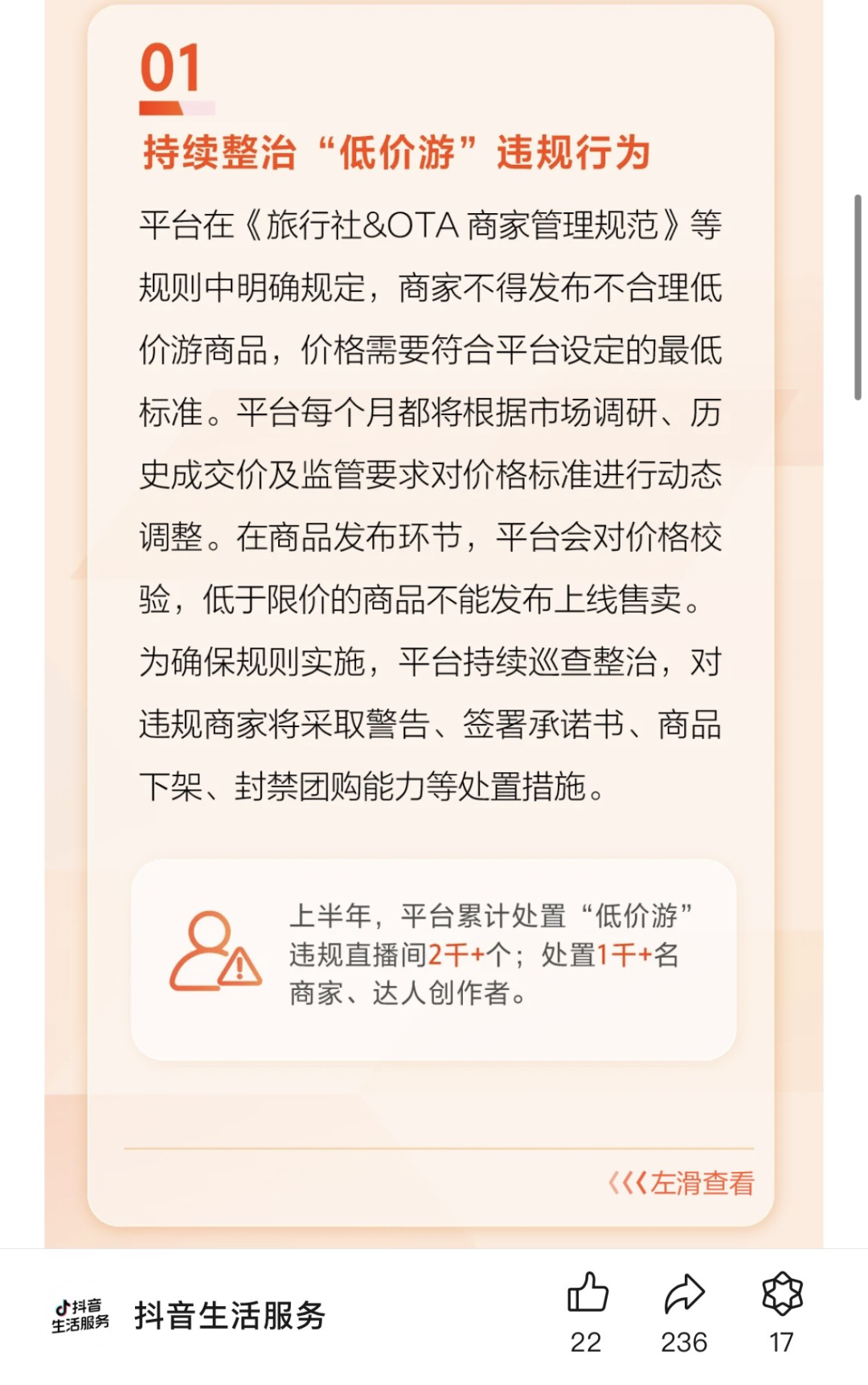 此外,針對(duì)日益突出的低價(jià)游問(wèn)題,為引導(dǎo)商家合規(guī)經(jīng)營(yíng),抖音發(fā)布了《商家旅行社違規(guī)分管理規(guī)則》,并上線“旅行社違規(guī)分”機(jī)制,對(duì)商家各環(huán)節(jié)表現(xiàn)進(jìn)行綜合評(píng)估,違規(guī)將受相應(yīng)處置。