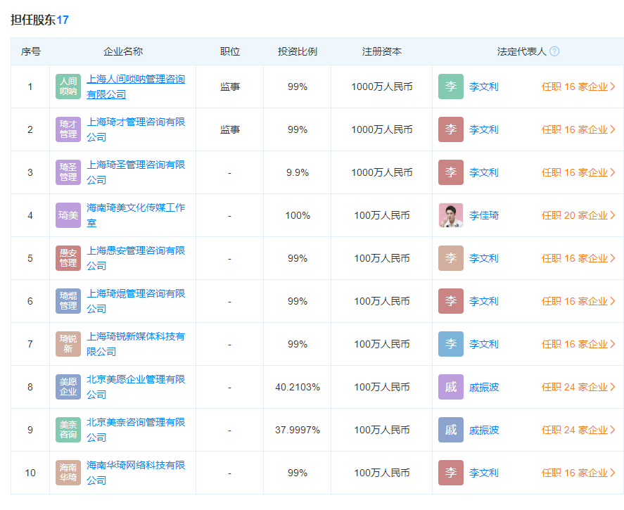 李佳琦最初只是一個(gè)歐萊雅的“柜哥”,被MCN公司美ONE的老板看中,試水美妝直播帶貨,沒想到一炮而紅,迅速成為淘寶帶貨一哥。據(jù)天眼查顯示,李佳琦名下有20多家公司,其中6家擔(dān)任法人,17家擔(dān)任股東,是不折不扣的“李老板”。