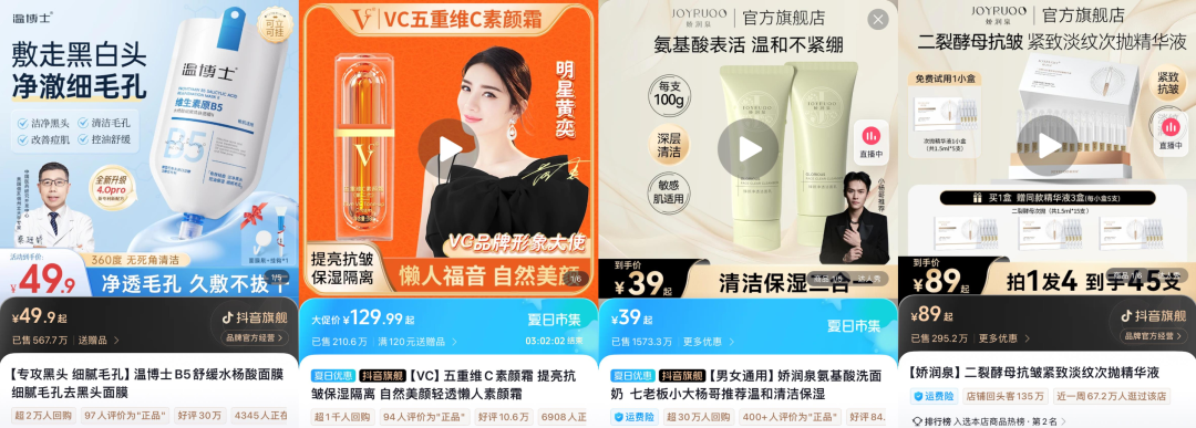比如溫博士主打袋裝的“B5舒緩水楊酸面膜”,僅靠這一個(gè)產(chǎn)品,連續(xù)5個(gè)月登頂抖音美妝-貼片面膜的細(xì)分類(lèi)目第一;VC主打“五重維C素顏霜”;嬌潤(rùn)泉?jiǎng)t主打“氨基酸洗面奶”和“二裂酵母次拋精華液”。