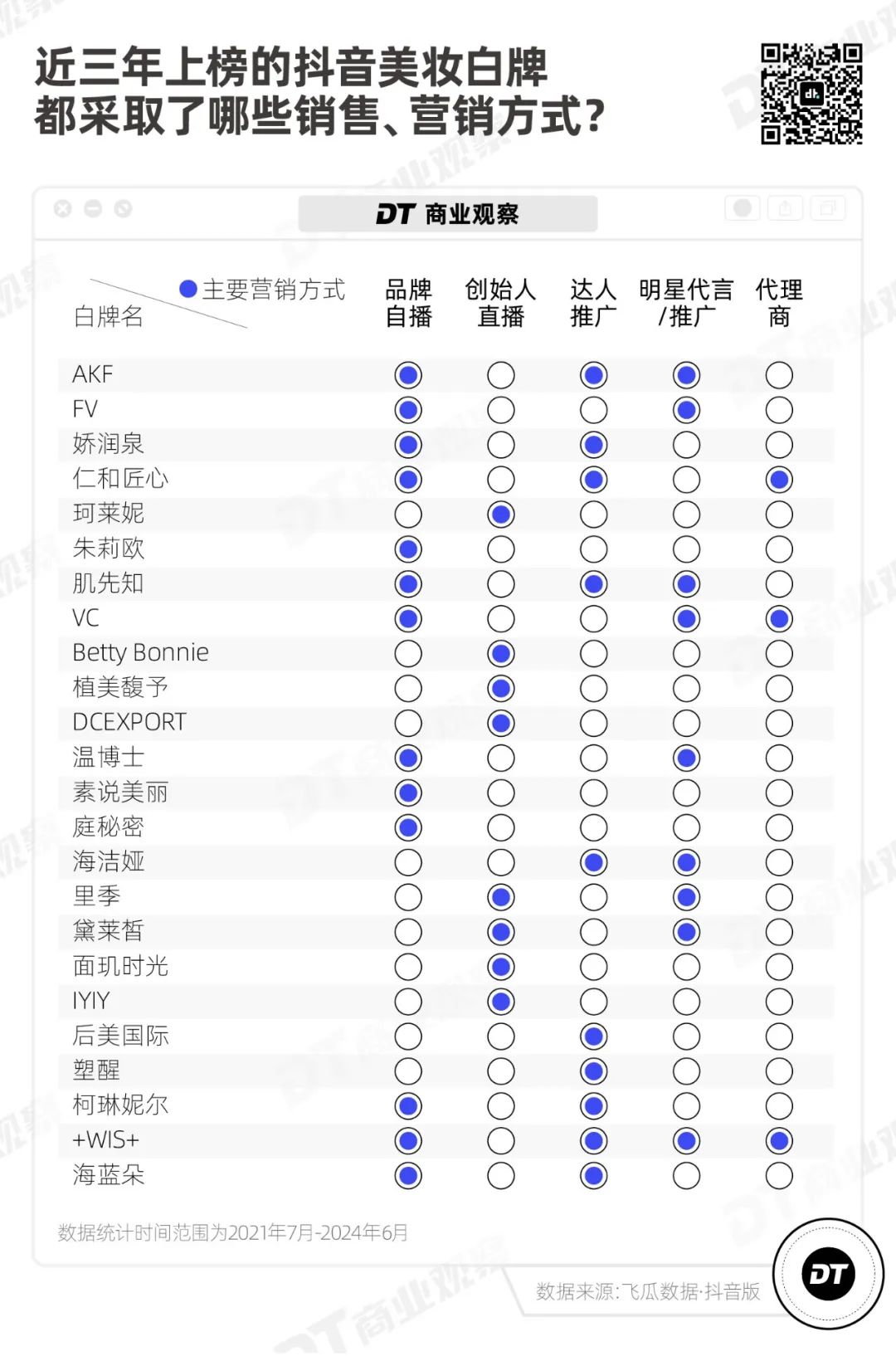 《DT商業(yè)觀察》統(tǒng)計(jì)了近三年(2021年7月-2024年6月)的抖音美妝月銷(xiāo)售額榜,發(fā)現(xiàn)曾經(jīng)沖進(jìn)榜單TOP 20的白牌有24個(gè)。品牌則有77個(gè),是白牌的3倍多。