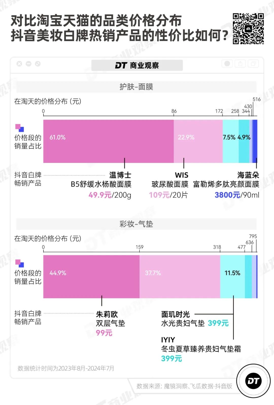 我們選擇了抖音白牌們分別在護(hù)膚和彩妝涉獵最多的兩個(gè)領(lǐng)域,即面膜和氣墊,并對(duì)比了這兩個(gè)品類(lèi)在淘寶、天貓的價(jià)格分布,發(fā)現(xiàn)暢銷(xiāo)的美妝白牌產(chǎn)品價(jià)格兩極化——