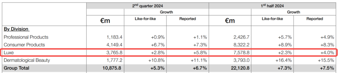 結(jié)合上述因素的影響,高檔化妝品部成為歐萊雅四大業(yè)務(wù)板塊中,增速最低的板塊。2024年上半年,以2.3%的增速居末位。
