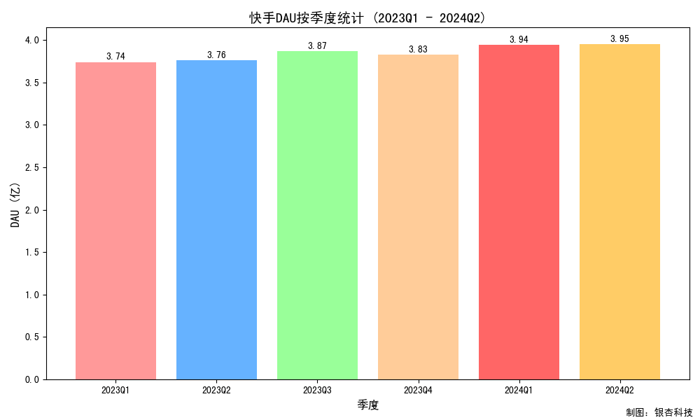 2024年二季度財報顯示,該季度快手平均日活躍用戶(DAU)和平均月活躍用戶(MAU)為3.95億、6.92億,分別同比增長了5.1%和2.7%,其日活躍用戶日均使用時為122分鐘。