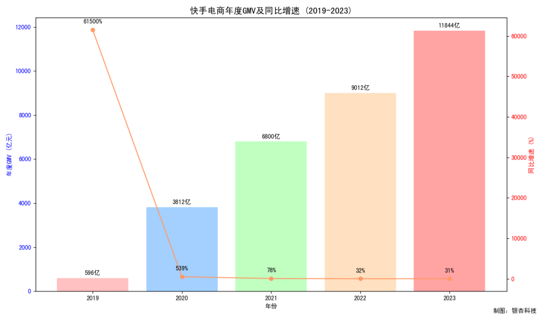 從2018年到2023年,快手電商年度GMV依次為9660萬、596億元、3812億元、6800億元、9012億元、11844億。幾年來,快手不僅在GMV體量上落后于淘天、京東、抖音、拼多多,自己的增速也在逐漸放緩,不及體量更大的拼多多和抖音。