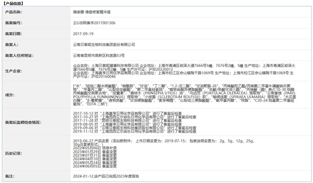 值得一提的是,該產(chǎn)品備案曾在2023年至今發(fā)生多次變更,最近一次變更時間為2024年6月5日,當(dāng)前備案人為云南貝泰妮生物科技集團股份有限公司,生產(chǎn)企業(yè)則為上海貝泰妮健康科技有限公司、上海嘉亨日用化學(xué)品有限公司,二者分別是貝泰妮與嘉亨家化的全資子公司。