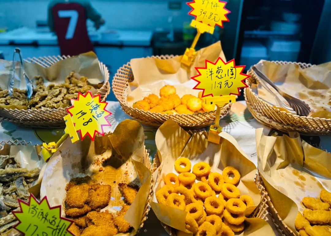 不到20平米的小店,分區(qū)清晰,立式冷柜售賣成品預(yù)制菜、早餐包子類凍品,臥式冰柜則清晰陳列各式速烹菜和腌制好的烤肉,隔壁臺子上,是后部加工區(qū)熱出即吃的炸品,小黃魚、小酥肉、蝦餅和洋蔥圈們在暖黃燈光下誘人而充滿煙火氣?繅吺请s貨調(diào)料區(qū)。