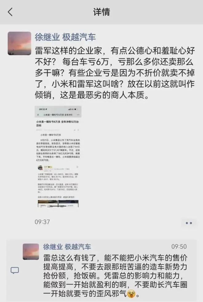 因?yàn)樾∶灼嚤炯径忍潛p18億元,有媒體據(jù)此計(jì)算小米汽車單車虧損超過(guò)6萬(wàn)元;結(jié)果極越汽車公關(guān)負(fù)責(zé)人徐繼業(yè)8月22日上午在朋友圈“陰陽(yáng)”雷軍,“每臺(tái)車虧6萬(wàn),虧那么多你還賣那么多干嘛?”