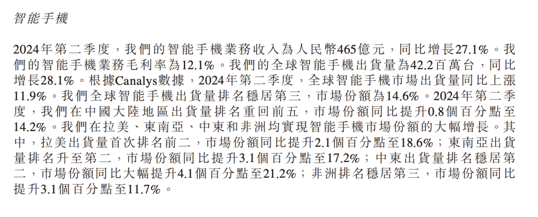 從手機(jī)業(yè)務(wù)來(lái)看,本季度小米的手機(jī)業(yè)務(wù)也在回血。2024年第二季度,小米智能手機(jī)業(yè)務(wù)實(shí)現(xiàn)營(yíng)收465億元,同比增長(zhǎng)27.1%。