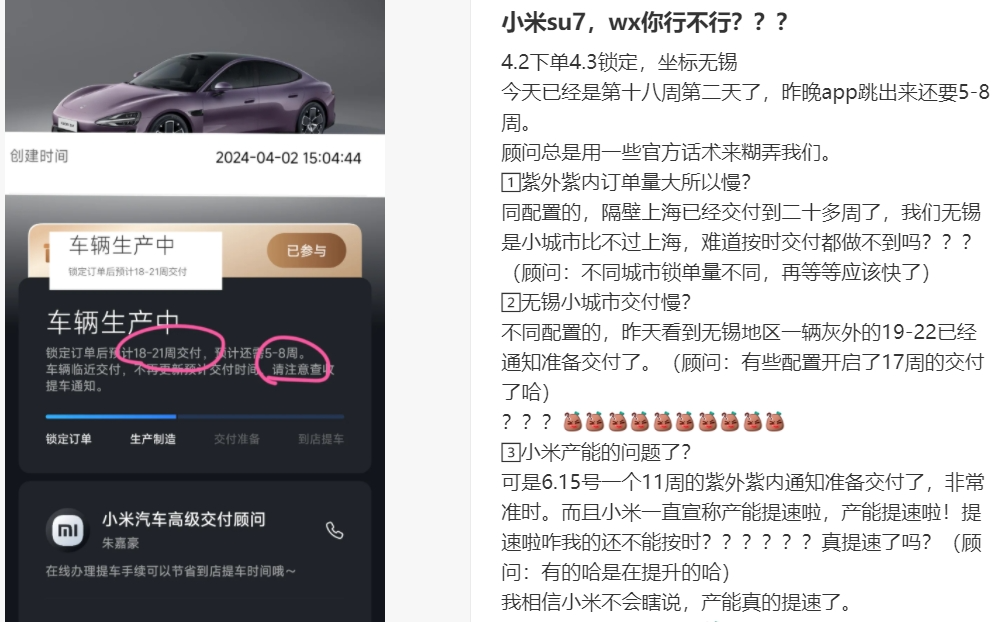 熱銷之后就是交付排隊(duì)。社交媒體平臺(tái)上,網(wǎng)友對(duì)于小米SU7的聲音已經(jīng)從“值不值得買”轉(zhuǎn)向成“還要等多久”了;一位無(wú)錫的消費(fèi)者表示自己4月3日鎖單后已經(jīng)等了十八周,但是打開(kāi)APP顯示還是要等5-8周,銷售顧問(wèn)說(shuō)的話也沒(méi)什么區(qū)別。還有很多“等車黨”網(wǎng)友紛紛在帖子底下回復(fù),稱自己4月初定的車,4個(gè)月過(guò)去了還是要再等5-8周......