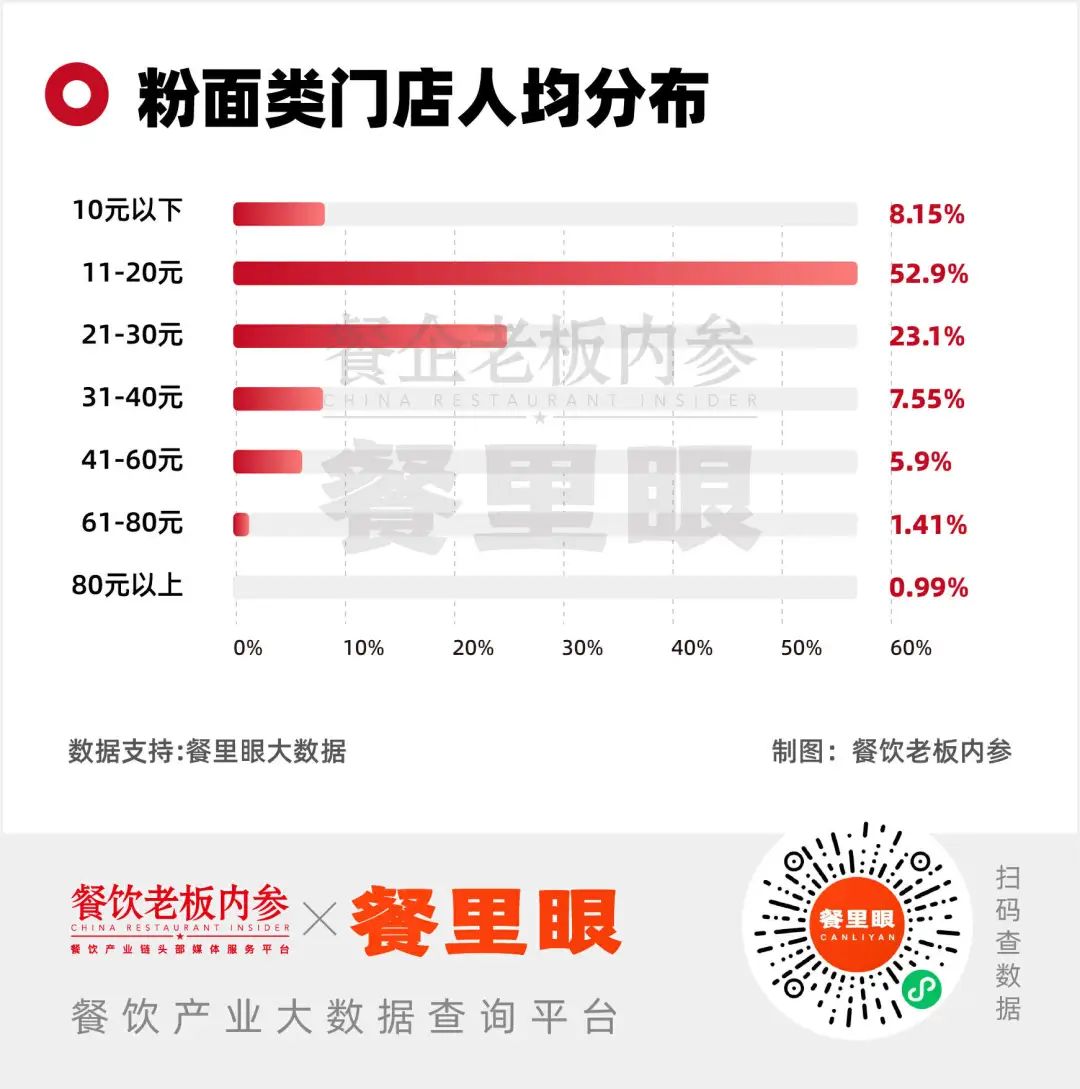 面館賽道的客單價,正在整體下探。餐里眼數(shù)據(jù)顯示,目前粉面類門店人均消費11-20元的占比,高達(dá)52.9%;40元客單價以上的面館占比僅占到了8.3%。