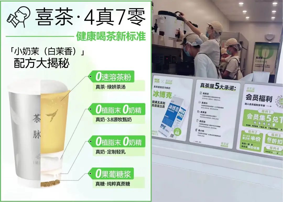 喜茶提出“四真七零”的健康茶飲標準,使用100%生牛乳,擺脫各種食品添加劑,給了中國茶飲新的改良思路。