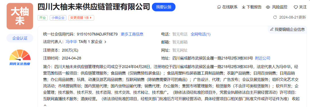 從企查查上可以看到,四川大柚未來供應(yīng)鏈管理有限公司注冊于2024年4月28日,注冊資本200萬,股東是馮中華和王婷,分別持股80%、20%。