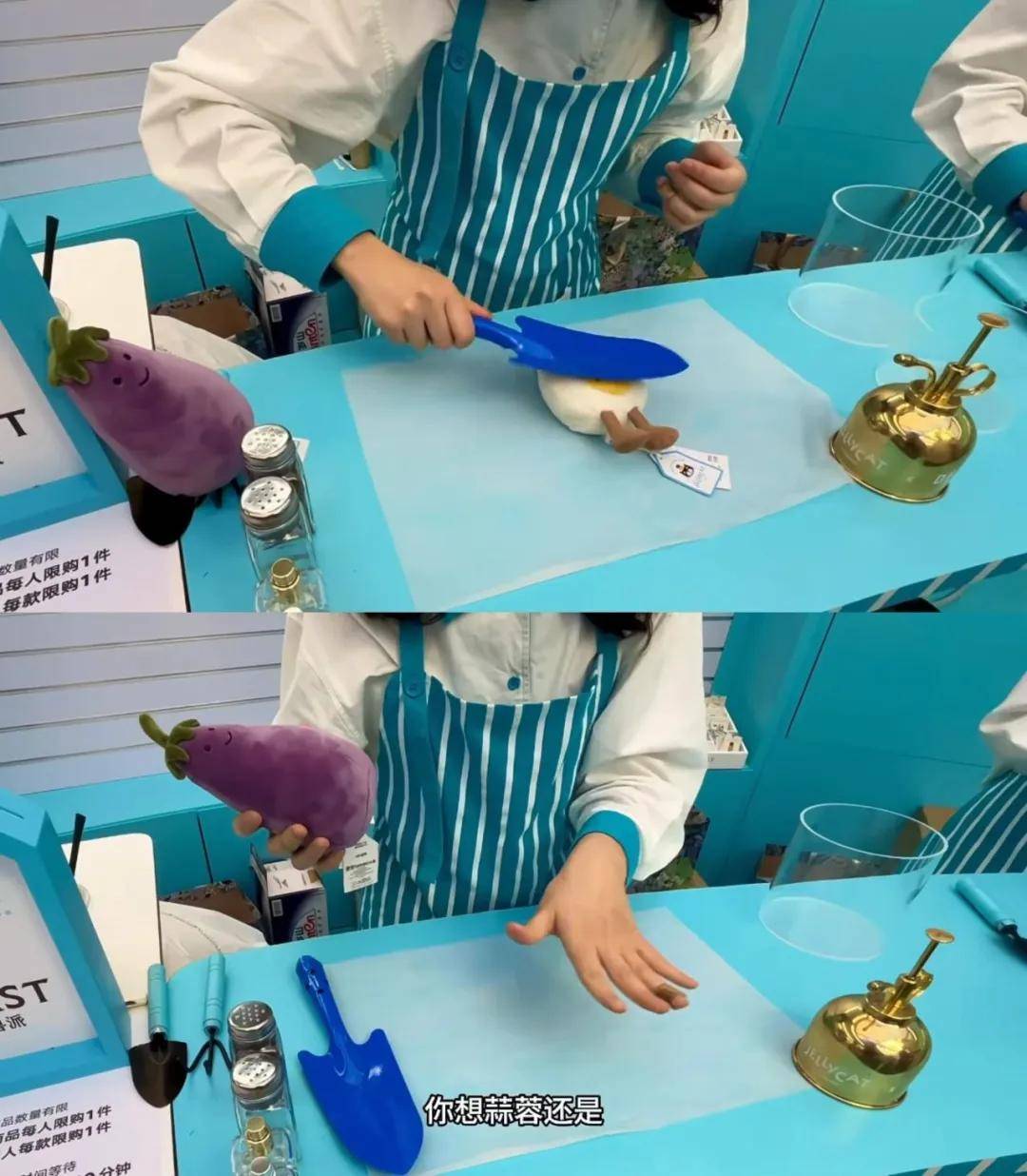 購(gòu)買“毛絨水煮蛋”時(shí),店員會(huì)拿著鏟子按一按雞蛋玩偶,并詢問顧客要單面煎還是雙面煎,是否放調(diào)料。