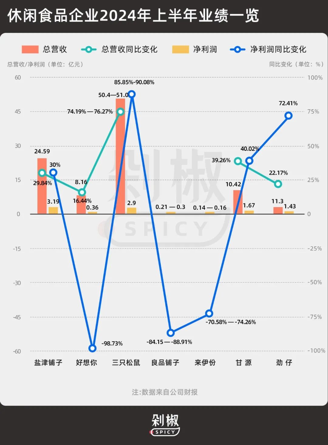近兩年,休閑零食品牌通過(guò)積極擁抱量販渠道,確實(shí)實(shí)現(xiàn)了業(yè)績(jī)的顯著增長(zhǎng),最典型的就是甘源食品、鹽津鋪?zhàn)雍蛣抛惺称贰_@些品牌在2024年上半年均交出了亮眼的成績(jī)單,甘源食品的營(yíng)收和凈利潤(rùn)同比增長(zhǎng)了39.26%和40.02%,而勁仔食品的營(yíng)收和凈利潤(rùn)同比增長(zhǎng)了22.17%和72.41%。