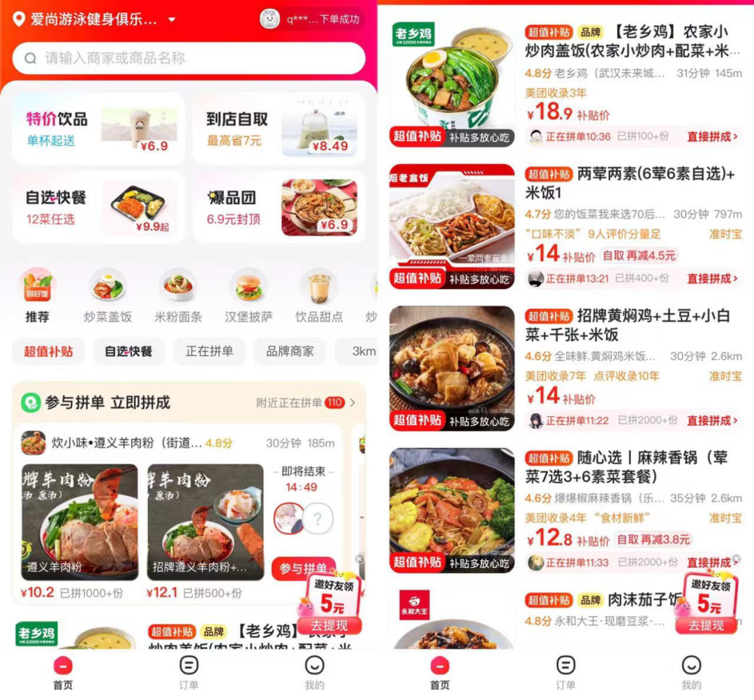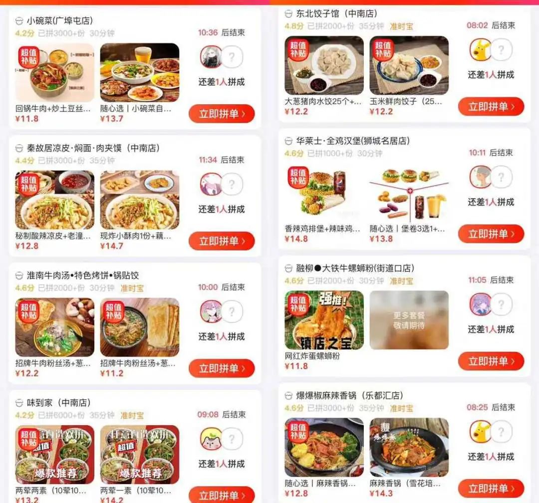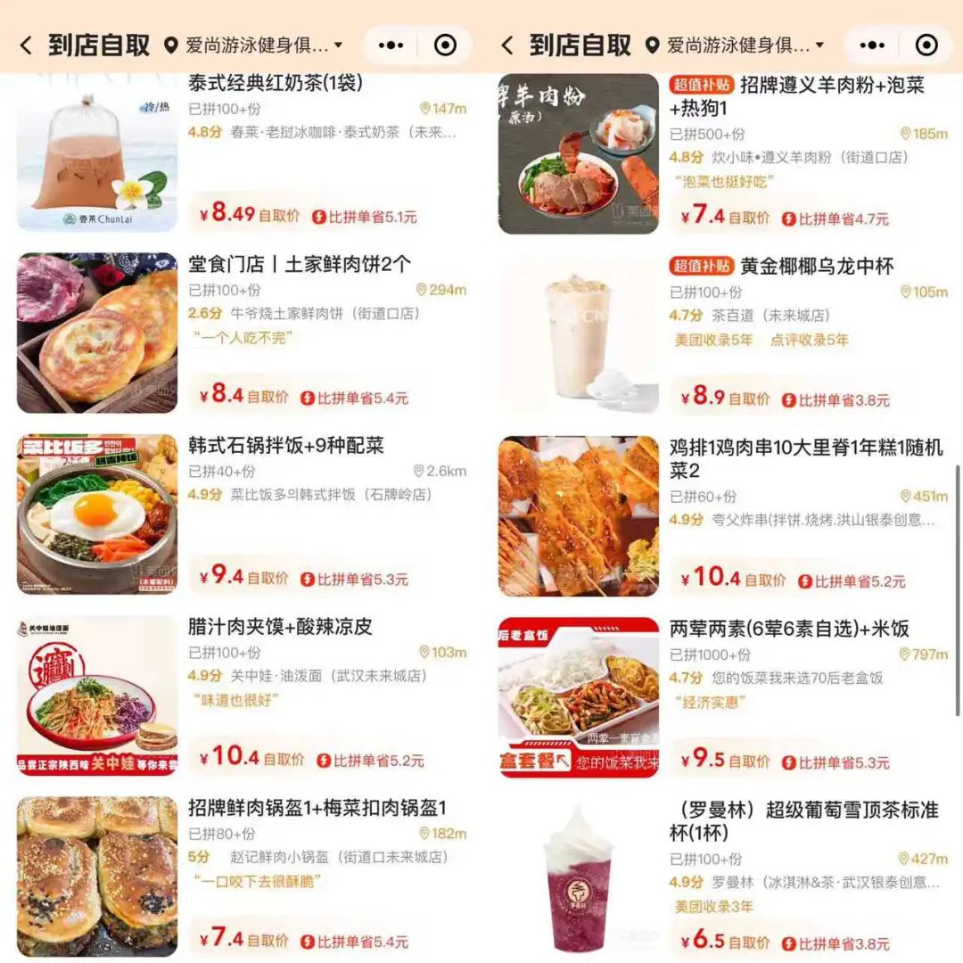 花6.4元能吃一份羊肉粉,花5.5元能喝一杯爺爺不泡茶的咸寧桂花,10.4元能吃上一份油潑面還能加個鹵蛋……這是餐觀局瀏覽的武漢拼好飯“到店自取”的真實價格,而且還不是新用戶福利。