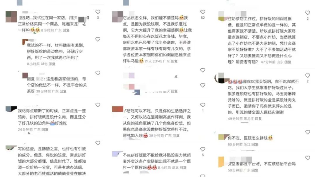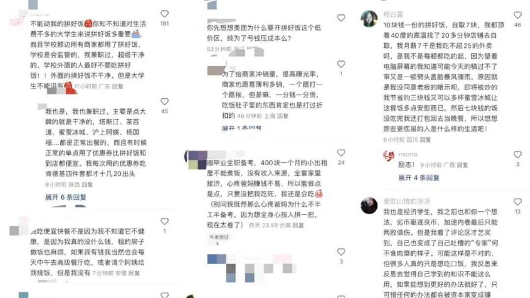 “我點拼好飯是因為我沒錢,它大大提升了我的幸福感,每天不用擔心吃飯花太多錢,畢竟房租水電已經(jīng)要了我半條命。”