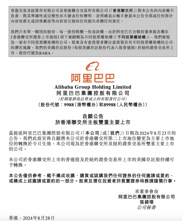 8月23日,阿里巴巴集團(tuán)曾發(fā)布預(yù)告,將新增香港為主要上市地,于8月28日在香港聯(lián)交所主板主要上市。