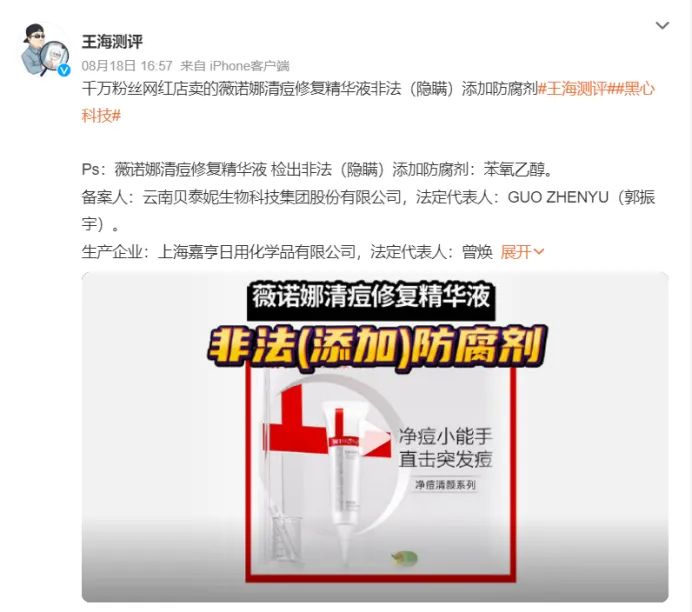 然而,“王海測評”認為,依據《化妝品標簽管理辦法》,檢測出的苯氧乙醇含量應視為常量而非微量,并且質疑原料自帶防腐劑的說法。