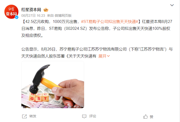 值得注意的是,當(dāng)初,蘇寧物流是以42.5億元分兩次收購了天天快遞,如今卻以1000萬元賣出,蘇寧物流為何要做這筆“賠本買賣”呢?
