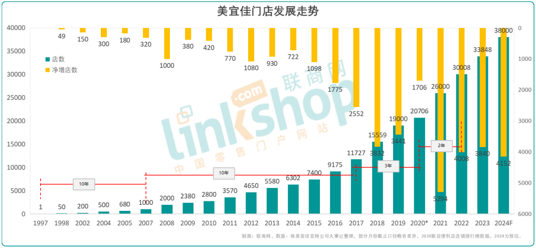 從0到1000家、1000到10000家、10000到20000家、20000到30000家,美宜佳分別用了10年、10年、3年和2年;未來(lái),隨著更多的區(qū)域城市開(kāi)出,美宜佳年增店數(shù),也在不斷增加量級(jí)。