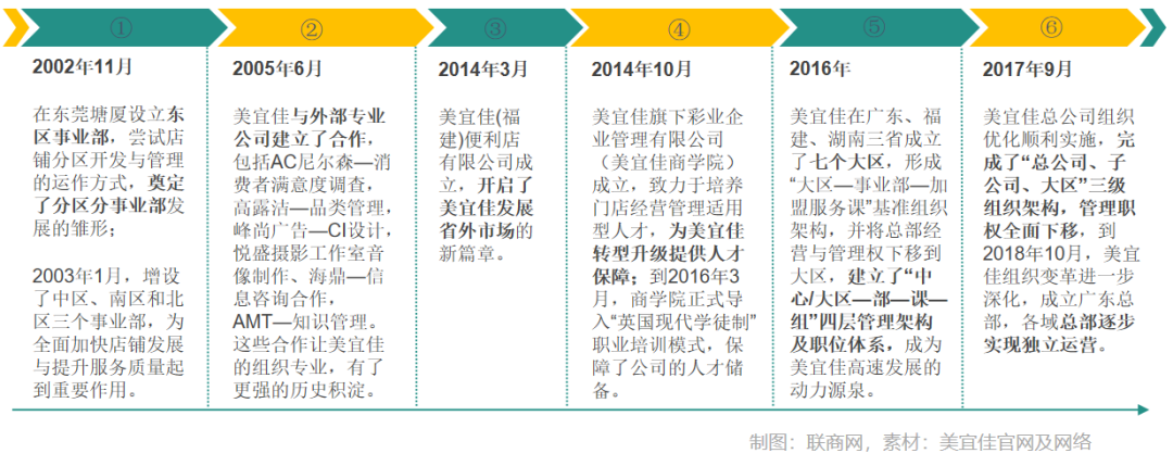 而在組織上,隨著規(guī)模的發(fā)展,美宜佳在不斷升級(jí),一些重要里程碑的事件,對(duì)美宜佳的正向發(fā)展起到了積極作用: