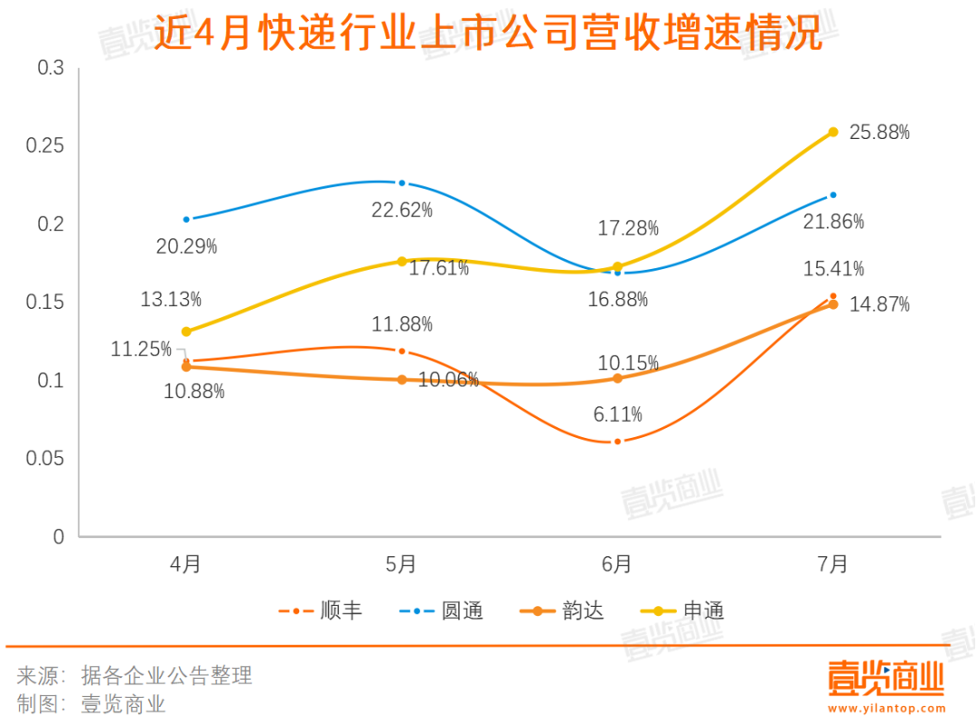 壹覽商業(yè)統(tǒng)計(jì)發(fā)現(xiàn),包括順豐、圓通、韻達(dá)、申通在內(nèi)的四家已上市快遞公司,近四個(gè)月?tīng)I(yíng)收幾乎都有同比兩位數(shù)的增長(zhǎng)。其中,申通在7月同比增速最快,達(dá)到25.88%。