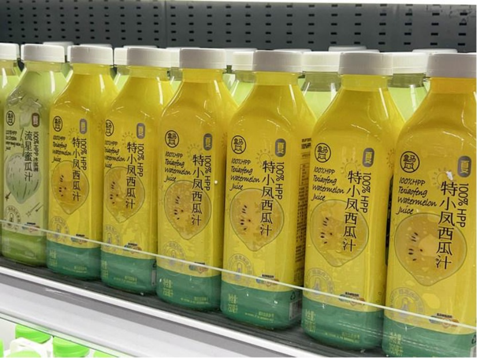 今年4月,江蘇東臺遭遇雨雪天氣,特小鳳西瓜錯過銷售旺季,盒馬聯(lián)動供應商緊急采購300噸,生產(chǎn)出HPP特小鳳西瓜汁上架銷售。不僅解決了瓜農(nóng)的燃眉之急,也讓消費者換種花樣吃西瓜。