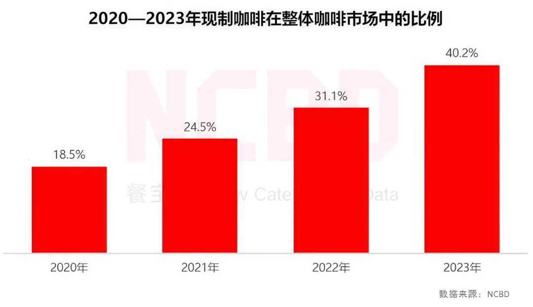 而庫迪咖啡所在的現制咖啡賽道增速更猛。餐寶典發(fā)布的《2023—2024中國咖啡行業(yè)年度發(fā)展報告》預測,“現制咖啡在整體咖啡市場的占比,從2020年的18.5%增長至2023年的40.2%,未來這一比例將進一步增大。”