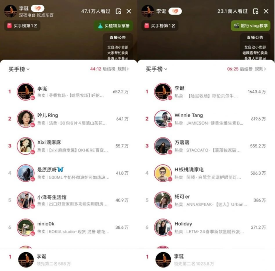 自開播以來,李誕的直播間屢次登上買手榜第一名,甚至人氣斷崖式超越第二名。
