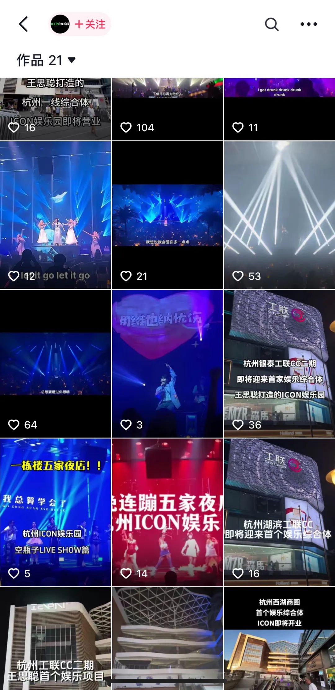 官方賬號為此拍了一條《杭州空瓶子LIVESHOW沉浸式體驗(yàn)VLOG》,并且置頂展示!翱掌孔觢iveshow”是知名連鎖店,從成都一路擴(kuò)散至全國,也是入駐ICON娛樂園的眾多酒吧品牌之一。