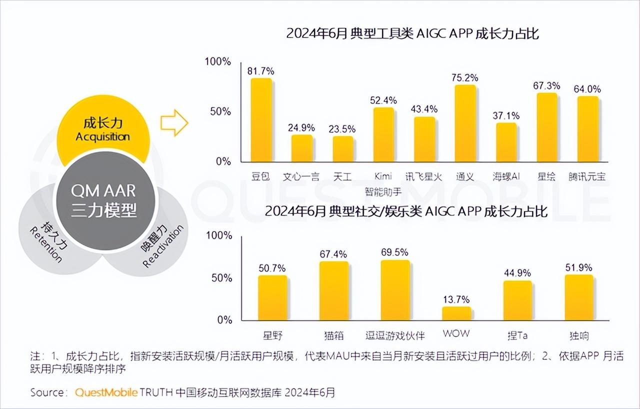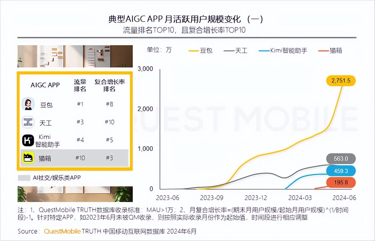 “砸錢”對(duì)整個(gè)行業(yè)的繁榮度肯定是有用的。今年6月的AI應(yīng)用月活數(shù)據(jù)表現(xiàn)方面,貓箱、Kimi等在AI應(yīng)用中增長(zhǎng)亮眼,與半年前的“籍籍無名”形成鮮明對(duì)比。