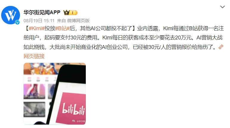 近期有媒體報(bào)道稱,在五個(gè)月左右的投流之后,Kimi在B站給出的CPA(Cost Per Action,用戶轉(zhuǎn)化人均成本)報(bào)價(jià),高達(dá)30元左右,這個(gè)價(jià)格對(duì)多數(shù)創(chuàng)業(yè)公司來說都是“降維打擊”。