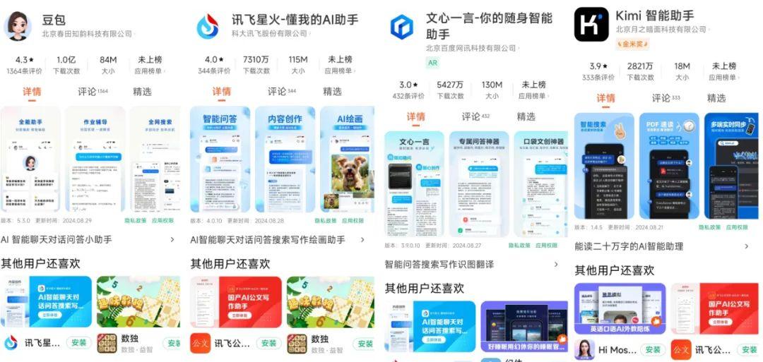 豆包在字節(jié)的“加持”下交出了一份不錯(cuò)的答卷。截至8月30日,“趣解商業(yè)”搜索發(fā)現(xiàn),在小米應(yīng)用商店內(nèi),豆包、訊飛星火、文心一言、Kimi四款應(yīng)用的下載次數(shù)分別顯示為1億次、7310萬次、5427萬次、2821萬次,kimi的下載次數(shù)與其他幾款相比差距不小。