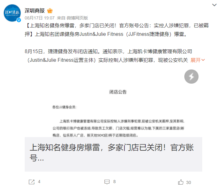 縱觀國(guó)內(nèi)健身房市場(chǎng),樂(lè)刻的發(fā)展已經(jīng)算不錯(cuò),不少傳統(tǒng)健身房要么在生死邊緣,要么已經(jīng)消失。前不久,知名健身品牌Justin&Julie Fitness發(fā)布公告,宣布下屬的三家直營(yíng)店閉店。6月,老牌連鎖瑜伽品牌卡莫瑜伽突然發(fā)布公告,稱正式永久關(guān)閉所有門店,并且沒(méi)有退費(fèi)能力。4月,高端連鎖精品健身房代表SPACE發(fā)布了《告知書(shū)》,宣布旗下北京、上海所有門店將停止運(yùn)營(yíng),公司將依法進(jìn)入清算狀態(tài)。時(shí)間往前,去年,國(guó)內(nèi)最大連鎖健身機(jī)構(gòu)之一的一兆韋德、頭部連鎖瑜伽品牌梵音瑜伽都關(guān)閉了門店。