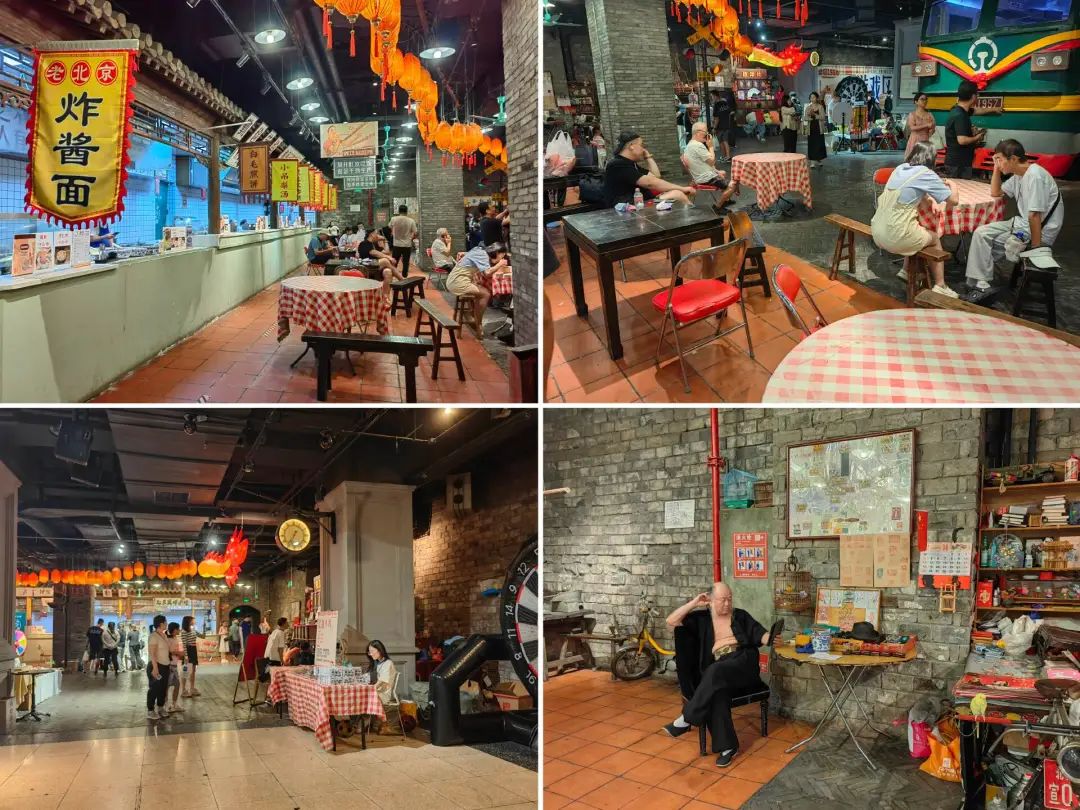 花30元購(gòu)票后,內(nèi)參君順著電梯“穿越回80年代”,這里主打懷舊復(fù)古風(fēng),老北京的胡同、門市映入眼簾。在餐飲區(qū),主要售賣老北京小吃,然而稀稀拉拉的客人并未坐滿,且基本沒有就餐的。在其它區(qū)域,游客也并不多,在整個(gè)復(fù)古空間的襯托之下,不免顯得有些冷清。一位“扮演”胡同大爺?shù)墓ぷ魅藛T,索性葛優(yōu)躺下,慵懶地刷著手機(jī)。