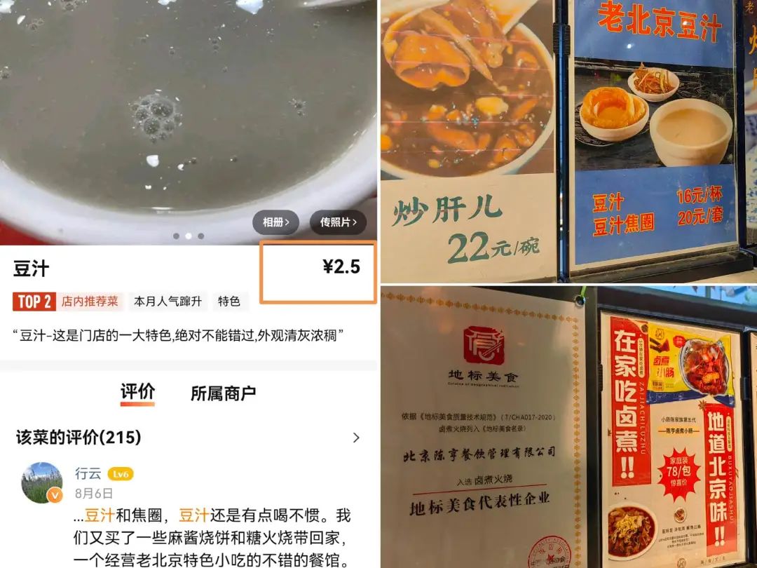 ◎左:某老北京特色飯館豆汁價(jià)格