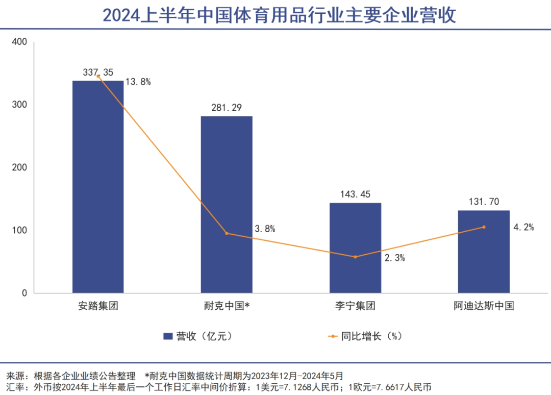 近年市場需求疲軟,體育品牌的業(yè)績表現均不盡如人意,諸如耐克、阿迪達斯等其他知名體育品牌在2024年上半年的營收增長也僅在個位數。除了安踏以外,大多數品牌的增長速度都低于同期的GDP增速。
