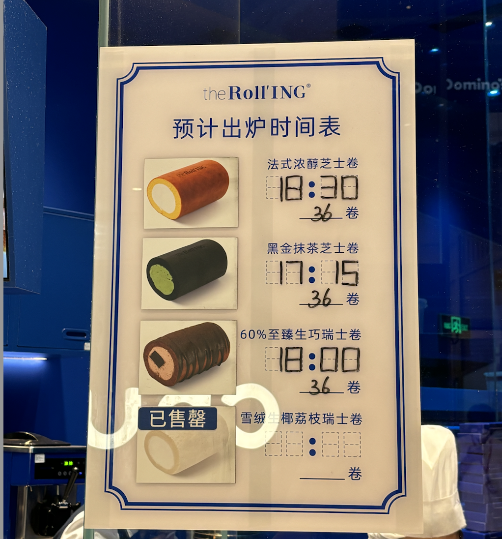 每種口味的瑞士卷都有不同的出爐時間,消費者每一輪排隊只有一個號碼牌,只能買到一種口味的瑞士卷。店員也是一絲不茍地、慢悠悠地在消費者面前完成每一步驟,能慢就慢,絕不加速。雖然消費者不一定能買到自己想要的口味,但卻能讓門店保持一種火熱的排隊?wèi)B(tài)勢。