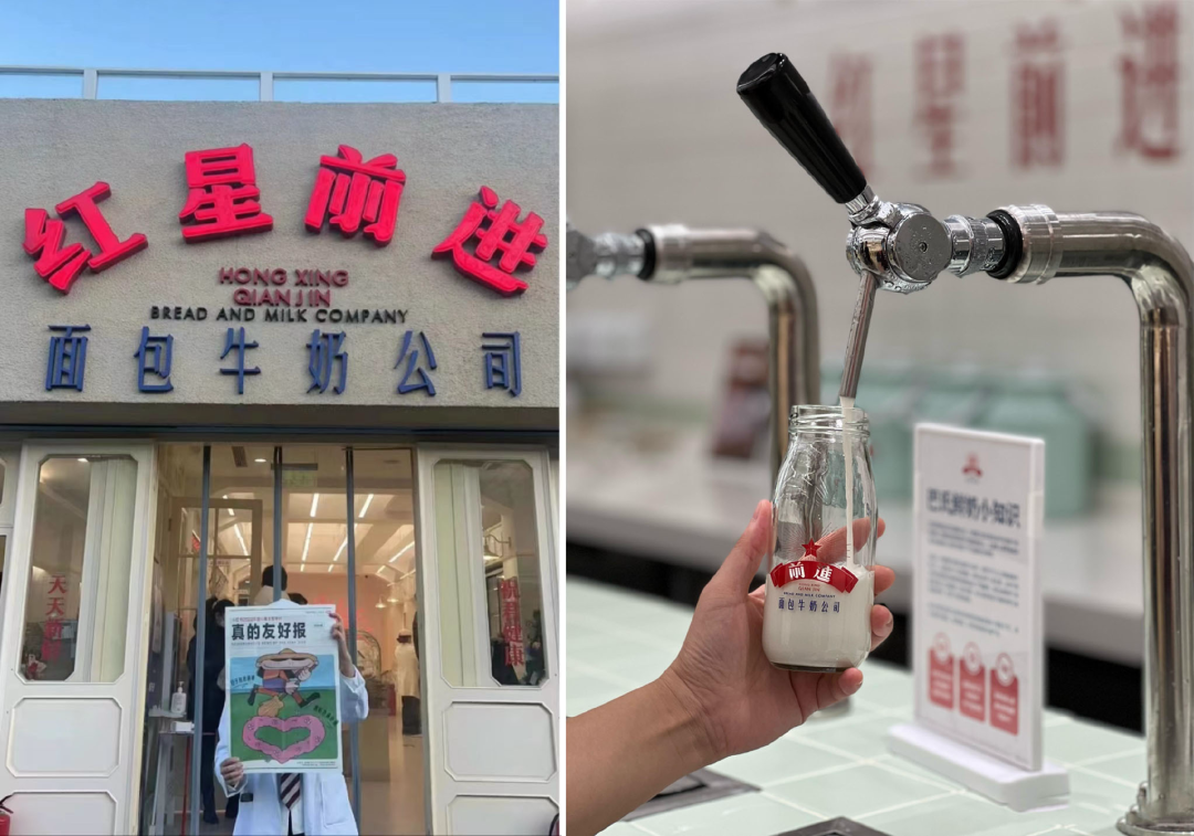 不光商家自己要表演,還要有小項目讓你也體驗一下,互動一下。像靠營銷大出圈的紅星前進(jìn)面包牛奶公司,不光售賣面包,更有現(xiàn)打牛奶項目可供體驗。