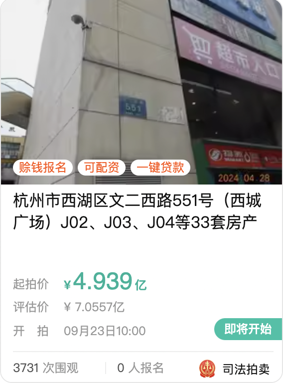 8月底,阿里資產(chǎn)平臺的司法拍賣頻道上架了關(guān)于“杭州市西湖區(qū)文二西路551號(西城廣場)J02、J03、J04等33套房產(chǎn)”物業(yè)的拍賣信息。該物業(yè)的評估價約7億元,起拍價4.939億元,將于2024年9月23日開拍。截至發(fā)稿,目前還是0人報名。