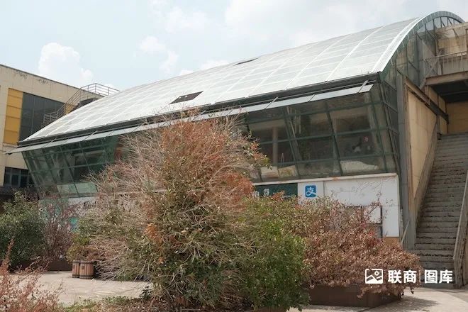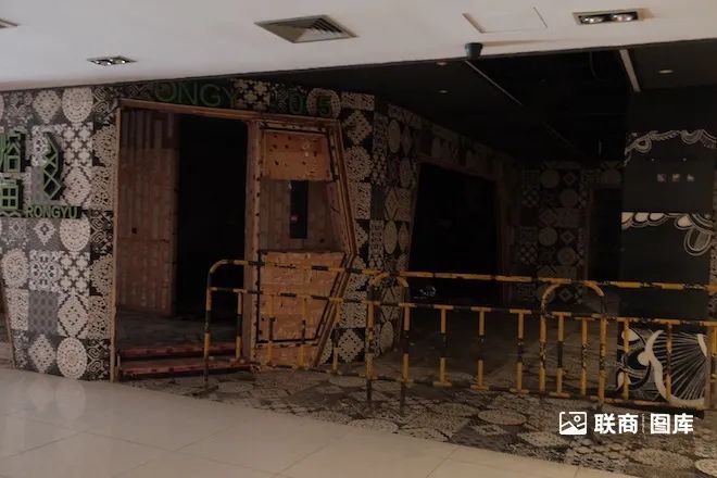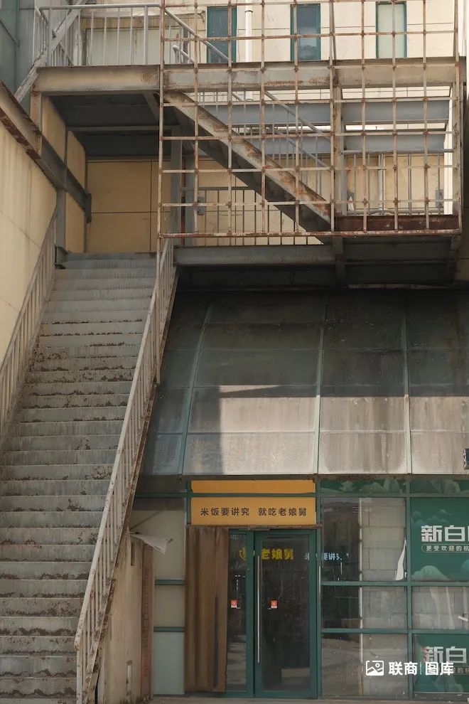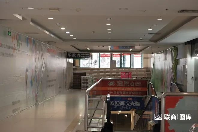 商場(chǎng)以前的中庭、扶梯都被拆除,如今都圍擋了。因此通往二樓只能從外面的步梯走上去(外面的扶梯已經(jīng)停了)。