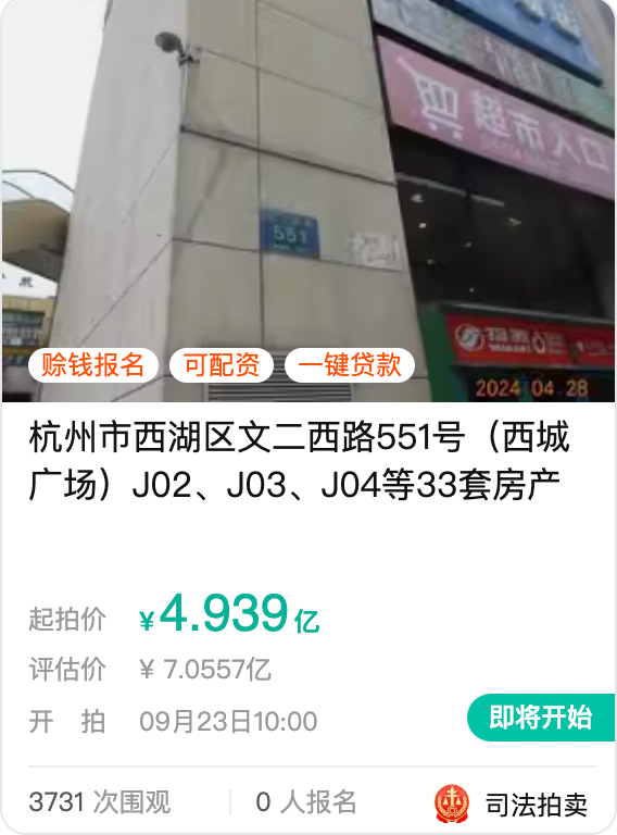 日前,阿里資產(chǎn)平臺(tái)的司法拍賣頻道上架了關(guān)于“杭州市西湖區(qū)文二西路551號(hào)(西城廣場(chǎng))J02、J03、J04等33套房產(chǎn)”物業(yè)的拍賣信息。