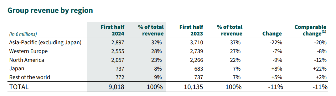 LVMH、開云今年上半年的業(yè)績不佳,很大程度受到了中國在內(nèi)的亞太區(qū)(不包括日本)影響。前者接連兩季度在亞太區(qū)有機營收增長為負,后者被亞太區(qū)高達22%的營收跌幅拖成吊車尾。