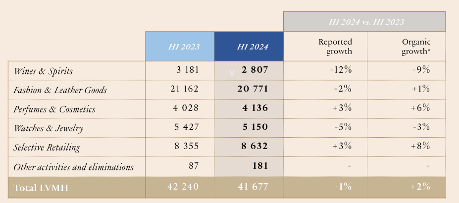 LVMH集團各部門業(yè)務(wù)表現(xiàn) 圖源:LVMH集團2024年H1財報